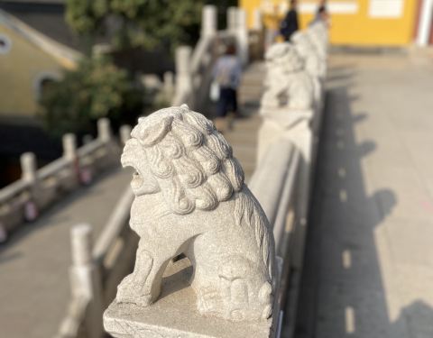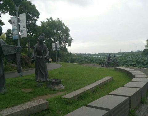 从金山湖西北门进入景区,经过一片开满荷花的木板桥,就来到了白娘子爱情文化园区,这里有几组放映白娘子与许仙日常生活的雕塑,从这边可以欣赏金山寺,风景优美。