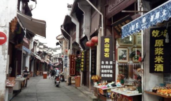 街两侧典型的古老的徽派建筑,走在青石板路上,两边各种山货特产、小吃——砚台、茶叶、烧饼、臭鳜鱼...
