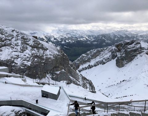 我们来到了瑞士的一个小镇,在这里坐缆车上皮拉图斯山 皮拉图斯山以拥有世界最陡的齿轨登山列车和最受游客喜爱的“金色环游之旅”(Golden Round Trip)而成为世界级的景点。沿途能欣赏到高山植被的变化,雄奇的山体和偶尔从眼前掠过的羚羊。缆车要做两站 大约半个多小时,之后到达一个中转站再做一个大的缆车上去,我们坐的是右边的缆车,缆车一共三站,前两站坐小缆车,最后一站坐大的观光缆车,全程大约40分钟。沿途的风光也十分漂亮,能看到很远的地方,在上面能俯瞰整个卢塞恩湖,景色太美了。到了中转站有很多小朋友在这里参加户外锻炼,看看人家那么小的还是就参加这种项目,在国内家长们基本是不会同意的。再往上的第二阶段,便仿佛进入了雪乡,放眼望去遍是皑皑白雪与挺拔的劲松,在阳光的呵护下宛若童话世界般。坐缆车大约十几分钟,我们便来到半山腰的第一处观景台。在远处,白云与雪山水乳交融,模糊了天与地的界线。第二个观景台再步行向上走五分钟的台阶,便可到达皮拉图斯雪山的最高处。爬行途中需要小心地滑,扶稳栏杆。我之前一直担心今天上雪山,是不是需要长衣长裤,事实证明虽然气温较山下有些低,但是完全不会觉得冷!一件外套足以 皮拉图斯峰顶再次给我们一个惊奇:两三千米的高山上竟然有一座富丽堂皇的五星级酒店和一个百货俱全的小型超市。由于卢塞恩的天气不好,刚登上缆车的时候超级遗憾的遗憾,雾非常大,能见度只有几米,下面的景色看的都不是非常清楚,整个人都有点小沮丧。但好在过了一会雾就散开了,渐渐可以看到天空的颜色,如梦如幻,简直就是宫崎骏动画片里的场景。覆盖着积雪皑皑,这景色太震撼了,没有身临其境的人,很难想象它的雄伟气势与壮美。以拥有世界最陡的登山列车和“金色环游”项目而成为世界级的景点。搭乘缓慢地在世界上最陡峭(48°)的山壁齿轮铁道爬升的齿轮列车到达山顶,沿途能欣赏到高山植被的变化。