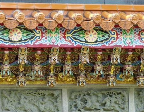 关渡宫位于台北市北投区,为北部古老的妈袓庙,是一座以佛教为礼,以道教为用的宗教场所,来自各地参拜的人络绎不绝。关渡宫约在西元1661年创立,主祀妈祖,原称灵山庙,位在灵山山顶。关渡宫年代久远,主殿的正面都是石墙为面,一面面雕满了各个历史故事,两侧的楼梯护栏都是用类似的石面浮雕,作品细腻。关渡宫殿前的石柱也都刻了蟠龙,加上石狮与壁雕,更为壮观;进入关渡宫殿内,殿顶的藻井、斗拱、梁椽都有很丰富的雕塑、彩绘,实为艺术。由于关渡宫香火鼎盛,因此关渡宫不断扩建,除圣母殿、观音殿、文昌殿外并有古佛洞,广渡寺、鼓楼、钟楼等。