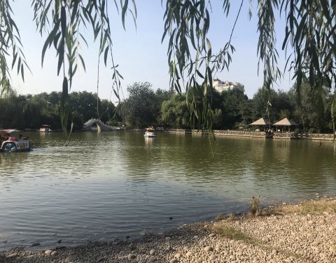 在淄博市中心,有很大的一片绿地,进来以后没想到里面别有一番洞天,这是个开放式的公园,里面有很大的一个湖泊,而且有假山做景,山上也不是很小了,还有小亭子,山水风光,而且还有很大的水上游玩的项目,在这...