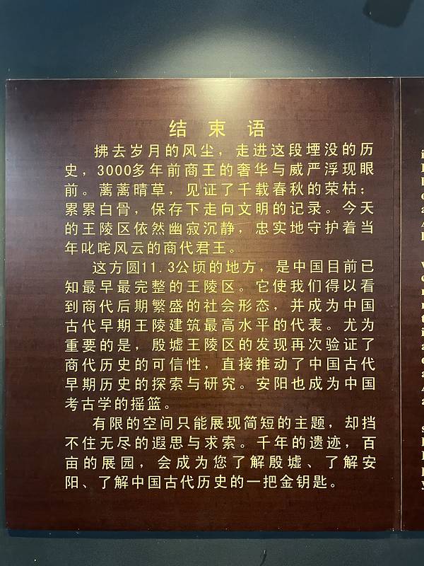 俗称的殷墟包含了两个地方:殷墟宫殿宗庙遗址和殷墟王陵遗址,两个地方分别都出土了非常让人惊叹的古迹:甲骨和司母戊鼎,这些都只在教科书上看到过,这次算是来到了他的出生地,感受一下商朝的礼乐文化。 殷墟王陵遗址距离殷墟宫殿宗庙遗址开车大概10-15分钟,王陵和宫殿之间还是有一段距离的,感觉很多人都放弃去王陵了,所以王陵这一片地广人稀,游客很少,因为是王陵地方真的很大,建筑物是真的很少。 •位置:安阳市殷都区小营村西1000米 •交通:在殷墟宫殿遗址检票口外等待30分钟一次的班车,景点免费来回接送(需要购殷墟大门票),到王陵遗址以后司机会告知你回去的班车时间,自己把握好时间即可。 •门票:包含在殷墟门票中,不用单独购买 •开放时间:8:00-18:00/8:30-18:00 建议游玩时间:0.5-1小时 殷墟王陵遗址,中国最早的皇家王陵,这里主要的功能是商代晚期商王陵地和祭祀场所,这里一共发现的王陵有12座,1座出土了司母戊鼎的大墓,还有2000多座祭祀坑和陪葬墓,出土的主要是青铜器、玉器和陶器,这些都是目前以后出土知道的,地底下可能还蕴藏着很多没有发现的大墓,这里是目前知道的最早、最完整的王陵墓葬群,代表的是中国古代早期王陵建设的最高水平。 现在对于历史的研究很多都是来自墓葬出土,这些地方是前人留给后世的最佳纪录,当然他们可能也没想到几千年后会被挖掘出来,随葬品也被陈列展出,他们的原计划是常伴左右永远享有的,只是现在我们需要通过这些来了解他们,文字叙述、物品展示让我们了解过去,很感叹文字的传情达意。 在没有纸的年代,他们把重要的事情记录在青铜器、陶器、玉器上面,之前还郁闷为什么好好的陶器上面要刻那么多的字,不累吗?现在想想,没有纸写字,刻在这些上面也是非常明智的一种选择,刻字只要不磨损基本上不会消失,比文字印刷记载容易保存。 在殷墟区域内,看到最多的就是关于司母戊鼎的复制品了,感觉所有的地方都在展示他,这个王者之器“中国最大的青铜器”,其他地方的复制品都是同比例缩小的,只有在王陵遗址内,看到了同比例的复制品,真的很大、很霸气,不过现在不叫司母戊鼎了,他改了名字,叫后母戊鼎。