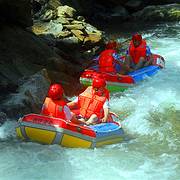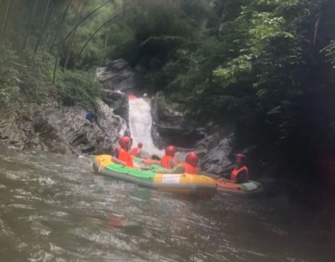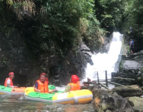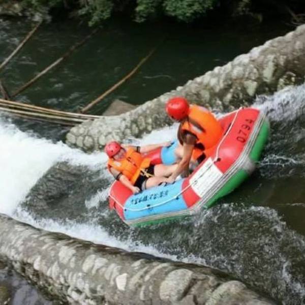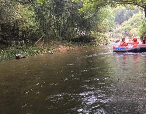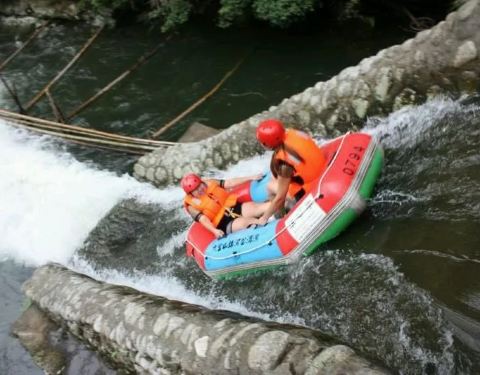 这个票漂流在前几年好火啊,这个漂流我去过。 他最大的特点就是在竹林里面飘,暴晒的几率比较少。 告诉大家一个小技巧,在下陡坡的时候一定要牢牢的抓住橡皮艇的把手,一般就不会翻船的。