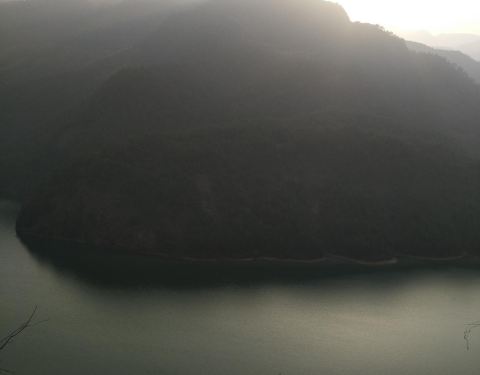在铜钹山下的绿树掩映之中,九仙湖以其飘逸的神态与山水相依,倒也十分的奇妙与般配。这里的游客并不多,湖面静谧得如一面镜子。