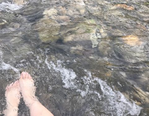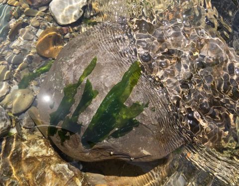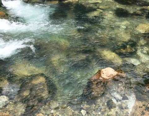 夏天的水清澈透凉,孩子在水里抓紫菜