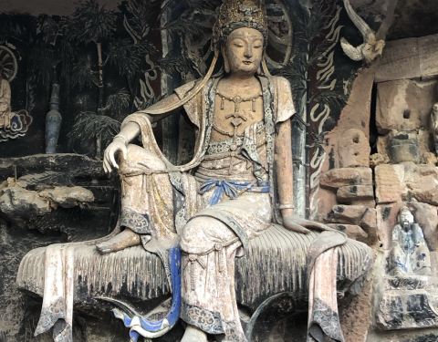 安岳的众多石刻造像里最为人所知的就是毗卢洞的“紫竹观音”,也被称为“水月观音”。正因为这尊美轮美奂的观音造像,紫竹观音俨然成为安岳石刻的代言人。 “水月观音”因背倚紫竹而得名,是北宋石刻的艺...