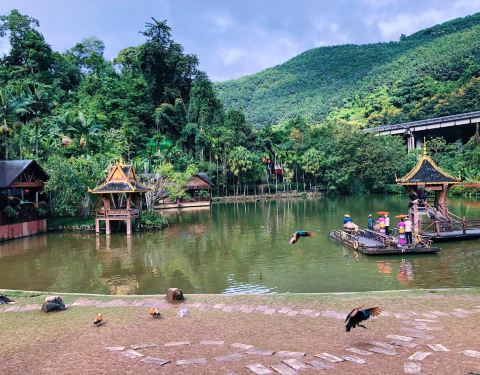 ...内,傣家楼式的建筑风格,依山傍水,掩映在热带雨林中,园区内的度假山庄,提供食宿,自然环境超级棒孔雀山庄,位于西双版纳原始森林公园内,傣家楼式的建筑风格,依山傍水,掩映在热带雨林中,园区内的度假山庄,提供食宿,自然环境超级棒。 孔雀山庄是“孔雀放飞”的表演地,是西双版纳原始森林公园入园后的第一...孔雀山庄,位于西双版纳原始森林公园内,傣家楼式的建筑风格,依山傍水,掩映在热带雨林中,园区内的度假山庄,提供食宿,自然环境超级棒。 孔雀山庄是“孔雀放飞”的表演地,是西双版纳原始森林公园入园后的第一个表演项目。数百只孔雀从远处雨林中飞来,煞是壮观,讲真,这是我第一次看见如此之多的孔雀。随后就是喂食,游客购买20元一盘的饲料,可以进入绿地内,零距离投喂孔雀。投喂结束后,饲养员吹口哨,挥舞旗帜,数百只孔雀再次起飞。 “孔雀放飞”表演,感觉很棒,值得一看。 孔雀山庄,饭菜质量尚可,特别是游玩一天后,饥肠辘辘,吃起来很香。 展开