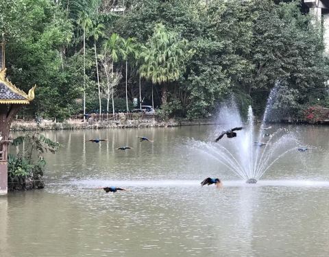 孔雀山庄位于森林公园内,湖畔的草坪有很多栖息的孔雀,花枝招展,还有翩翩起舞的傣族舞蹈,环境优美...西双版纳热带雨林风光,动植物丰富,孔雀山庄位于森林公园内,湖畔的草坪有很多栖息的孔雀,花枝招展,还有翩翩起舞的傣族舞蹈,环境优美,生机勃勃,全家游玩地很开心!