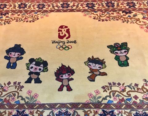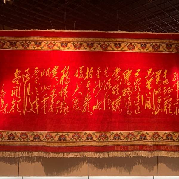 和田地毯博物馆,是一个出乎意外的惊喜。 博物馆不大,但馆内珍藏了很多精美的地毯,门票免费,登记即可进入。 图1,用在和田尼雅遗址出土的、著名的“五星出东方利中国”的汉代织锦护臂的图案,织成的精美地毯。每次看到这个“五星出东方利中国”,我都怀疑是不是真的有穿越。 图2,著名诗篇。这个也能织成地毯,太牛了! 图3,金秋的金胡杨,太美了! 图4,2008年的北京奥运福娃,这块地毯是铺在地上的,脚感很好。 图6至图9,都是悬挂起来的,至少2.5米高的地毯,花纹繁复精致,非常漂亮。