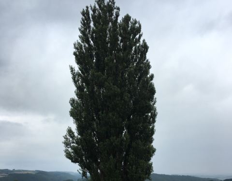 这是拼布之路上的一处起伏的山丘,在流线型的山丘上,永远挺拔着一排白杨树。无论是覆盖着绿色植物的山丘、或是已经收割后的一片黄土地,这片白杨林都是深绿色的站立在那里,为拼布之路的调色盘上增添一抹美的色彩。
