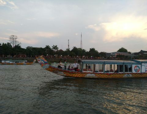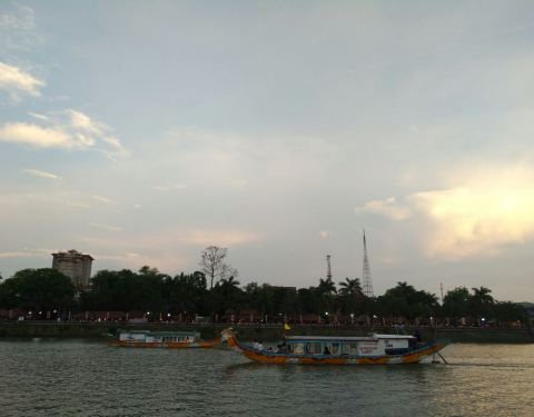 顺化香江比较宽广,两岸绿化不错,还有一些建筑值得一游,有很多的游船,游船沿江航行估计1个半小时左右吧!太阳落山景色特别美。
