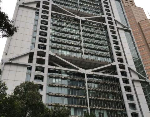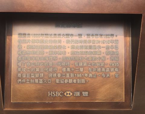 现今香港汇丰银行大厦位于香港中环,在皇后大道中和德辅道中之间,邻近皇后像广场、渣打银行大厦,也接近港铁中环站。高楼建于1986年,高度178.8米,楼层54层。整栋大楼看起来很像是变形金刚,大楼设计精巧,使它至今依然被誉为世界上创意建筑物之一。大部分的游客包括本地人都以为铜狮所在处是正门,其实面向长江集团中心的入口才真正的是正门。在门口有置放着两头雄狮,张嘴吼叫的是“史提芬”,名字来自于1920-24年的香港总行总司理史提芬(A. G. Stephen),而铸造铜狮也来自他的倡议。另一头铜狮称为“施迪”,也是当时上海分行经理施迪(G. H. Stitt)的名字。两头狮子惟妙惟肖、一头雄壮威武,一头内敛沉稳;曾在2战时期被日军掠夺,后来日军战败,被美军遣返回香港被放置在原位。至今观赏铜狮还能看见它们身上的一些不显眼的弹痕。走入到银行的大厅内部,从大厅往上看就是一个高达11层的中轴庭。站在中轴庭下,虽然自己会被四周的开放式办公室所包围,而且这里有意思的是,这里明亮又宁静。这是由于在开放透明的设计,让自然光线充满大楼;而大楼在声学科技的精心设计下,噪音也可以受到一定的控制。地下大堂门对着正南、正北方向,冬夏都能保持大堂的凉爽,很是难得。从中轴庭坐自动扶梯上去,可以逐层参观。每一层都有不少的银行工作人员忙忙碌碌,办公室都是透明的,哪怕站在下面也能看到上面的整体构造。要是建筑爱好者们可以好好好的观察一下。按照路标提示走到中部电梯时可以依稀的俯瞰远处的维多利亚港。游客建议到20层楼的时候可以搭乘扶梯下楼,因为上面的景色一样也没有观景台可以眺望。走出大楼外,如果是细心的话可以瞧见汇丰大厦上面似乎有两门炮,也许会感觉到差异,这个就要提到与汇丰不远的中银大厦,中银大厦上半部分设计成三角形,其中的一侧锐利墙角恍如一把锋利无比的利剑或似大刀,直接劈向远方的港督府和汇丰银行。而另一侧锐利的墙角则劈向李嘉诚的长江大楼总部。另外,在晚上的时候也合适来大厦瞧瞧,夜晚的汇丰大厦更加的光彩靓丽。大概6点左右,夜幕降临后大楼上的各式各样的霓虹灯就闪烁起来,这时可以到大楼可外面与这栋大楼合影留恋。