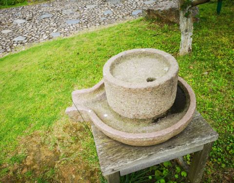在舟山市普陀沈清园(沈院)中,正逢春末夏初,绿茵遍地,植物满园,而池边小径上点缀着的一个个旧石盘、石缸,与这些绿植相映成趣,形成一道奇特的景观。