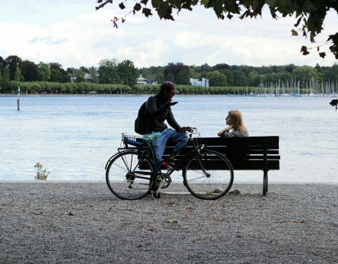 坐在湖边享受秋天的阳光与凉风 耳边有沙沙的落叶声 阵阵波浪拍打岸边的水声 海鸥 天鹅 和鸭子的叫声 还有远处教堂隐隐约约的钟声