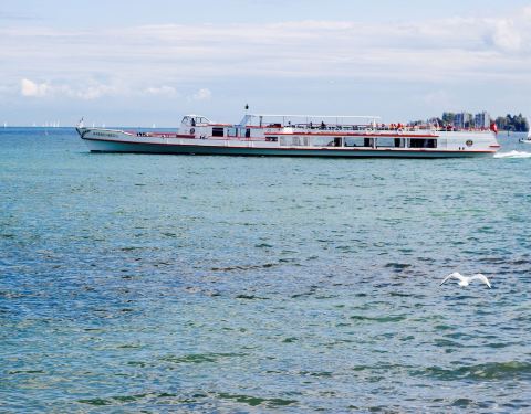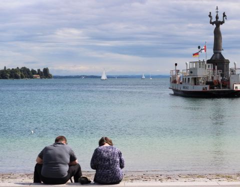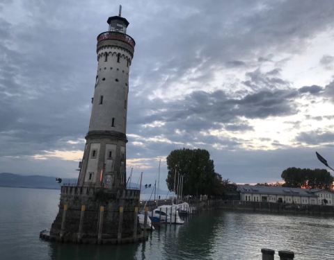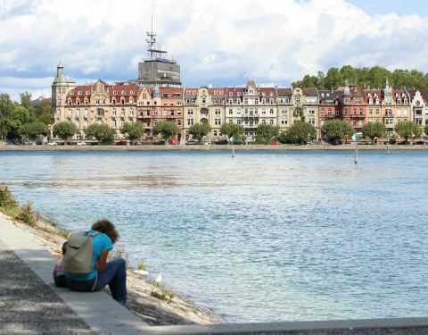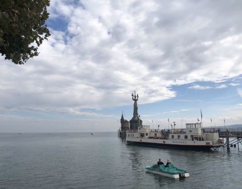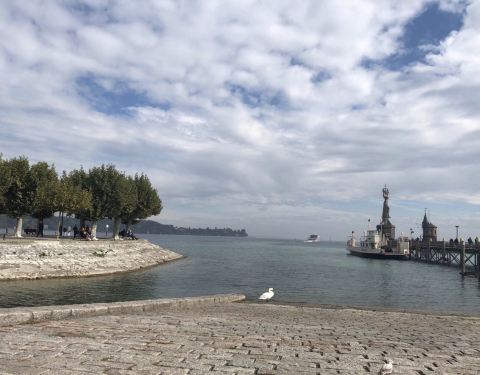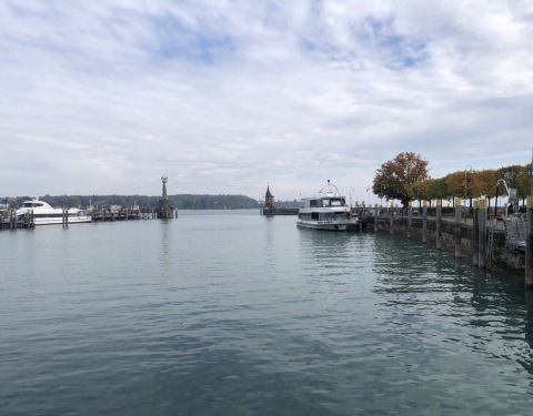 近德国边境,左边与奥地利相邻,右边与瑞士接壤,是一个重要的港口城市。湖上停泊着好几艘游轮,看来也是邻国人民的度假好去处