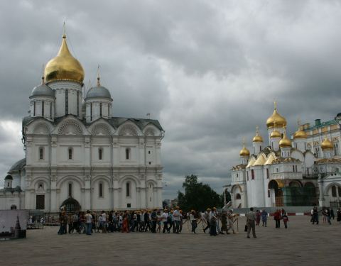 大教堂广场是莫斯科克里姆林宫的中心广场,得名于面向它的三座大教堂大教堂广场是莫斯科克里姆林宫的中心广场,得名于面向它的三座大教堂。每周六中午有仪仗队表演,广场面积不是太大,但也是游客最多的地方。