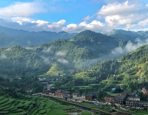 放眼望去,是一望无际绿意盎然的田野和山丘,绿油油的稻田遍布山间,呈现出一幅幅美丽的图画,相对封闭的地形条件、和谐安宁的苗寨、清澈诱人的白水河、茂盛的植被覆盖、成片的梯田景观,构成了一幅优美的苗岭山水田园风光,让人如痴如醉。