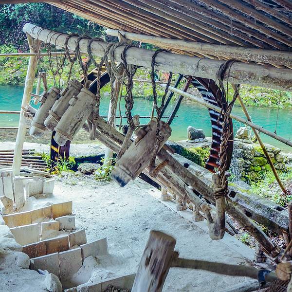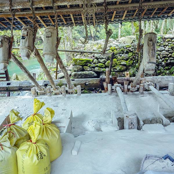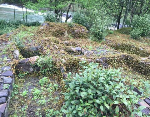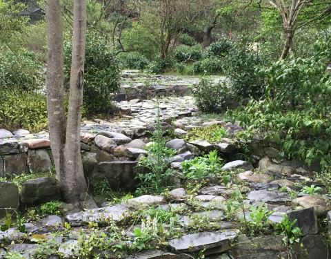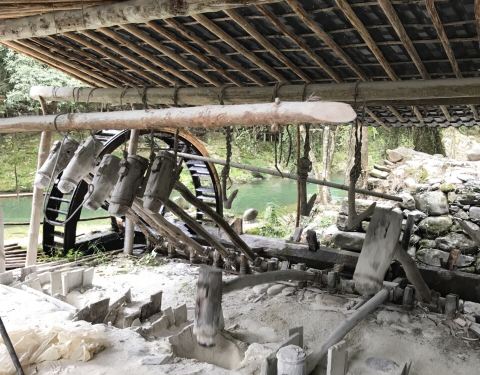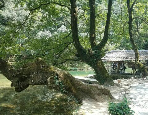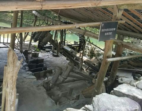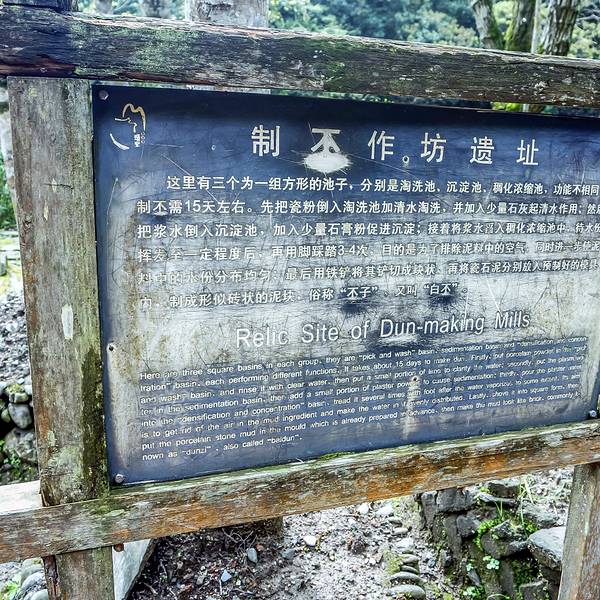 这也是瑶里联票包含的,也是需要自驾或者包车才能来。景德镇城里有古窑民俗景区,那里有龙窑、狮子窑、馒头窑等等,都是复制品。古窑民俗区也可以动手参与制作,但是很贵,拉坯一次30元。这里也可以,价钱也便宜。 这个景区可是古窑遗址,不是假的,是真的,龙窑就在这里! 走进景区沿着游览路线前行,一直有青碧的溪水相伴,走到大水车旁,水车正在运转,溪水中一个男人正在刷洗一种灰色的小石块,后来看到路边牌子上的警示“矿石原料,不要乱动”才知道这是瓷器的釉料。 要去看古窑遗址要走过不到1米多宽的没有护栏的木板桥,我极其小心地走过。路边有低矮的茶树,有高大的樟树,虽是炎夏也不觉暑热,这个地方我喜欢。