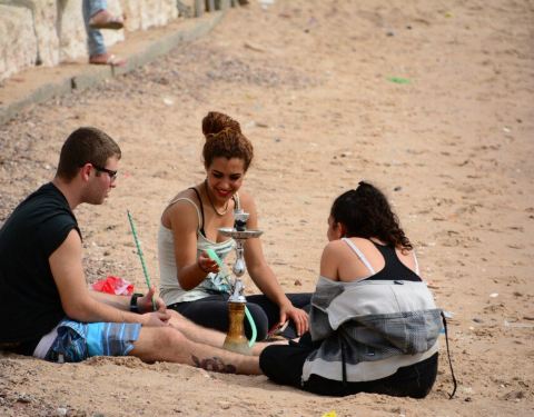 埃拉特的红海对岸就是约旦的亚喀巴,约旦的国旗清晰可见。红海边有美女在抽水烟,也有一家子在戏水。