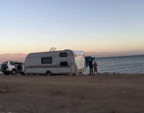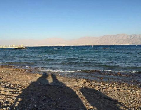 埃拉特红海边,眼前看到的是湛蓝湛蓝的海水衬着远处红色的山。下午四点不到,整个海滩几乎又只剩我们两个人坐在那看海了。离开海滩,沿90号公路继续南行5公里就到了埃及边境了。一路看到很多房车扎营在海边,喝着...