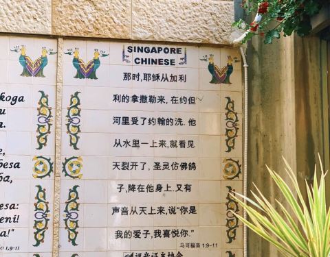 约旦河洗礼处河面不大,水面波澜不惊,窄窄的河两岸桉树茂盛,倒映在水里, 与筑在河水里的扶栏相映...约旦河洗礼处河面不大,水面波澜不惊,窄窄的河两岸桉树茂盛,倒映在水里, 与筑在河水里的扶栏相映,有一种静溢之美。来到这里自然会生出一种神圣之感。