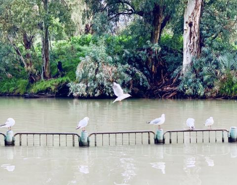 约旦河洗礼处河面不大,水面波澜不惊,窄窄的河两岸桉树茂盛,倒映在水里, 与筑在河水里的扶栏相映,有一种静溢之美。来到这里自然会生出一种神圣之感。