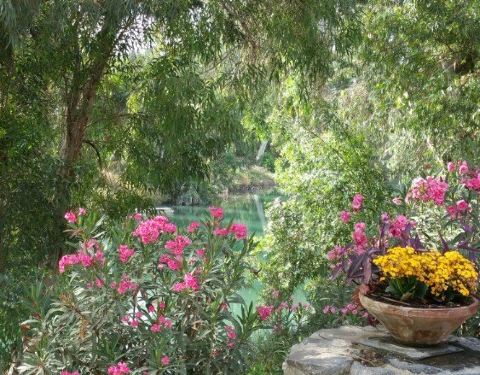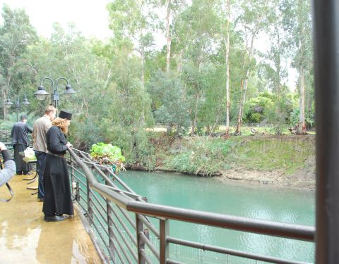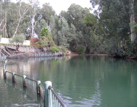 约旦河洗礼处河面不大,水面波澜不惊,窄窄的河两岸桉树茂盛,倒映在水里, 与筑在河水里的扶栏相映...