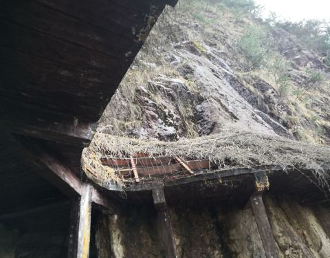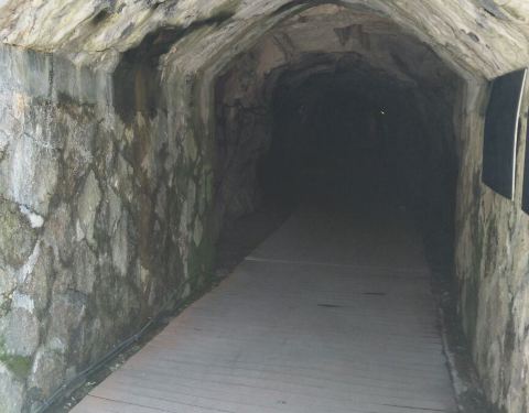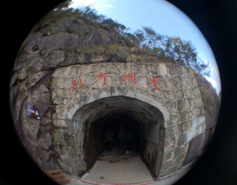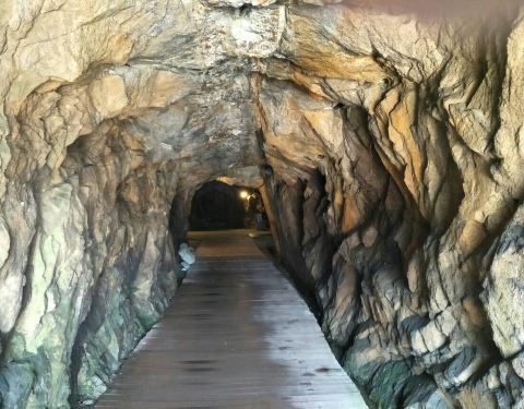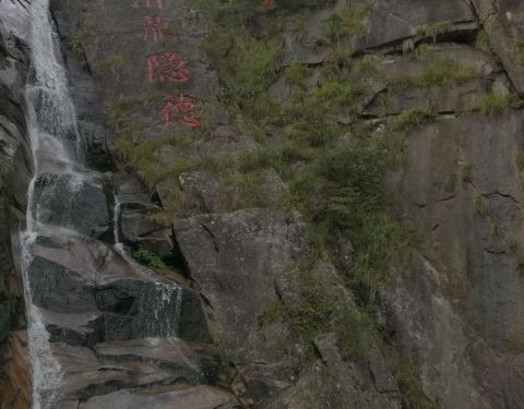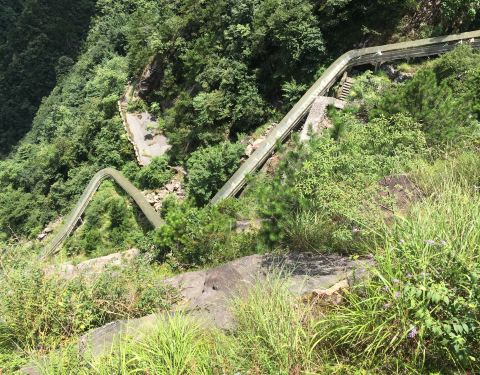 大明山的栈道可能是浙江省内景点中最长的栈道了。栈道西起龙门飞渡索桥,过索桥再上行可登高看千亩田。栈道中间经过下山滑梯,东至大明湖一侧的一个洗手间附近,说是洗手间,其实外面有阳台可以观景,室内还有桌椅供休息,还有一些根雕字很有观赏性。 如果觉得栈道太长,可以走隧道,隧道内有一个人工开凿出的一线天,据说是以前采矿时留下的,路过时可以看一下。