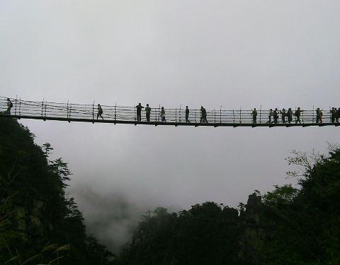 在大明山内的一个吊桥,龙门飞渡索桥很好玩,走在上面会摇摆的,我会害怕,向下看就是万米深渊。