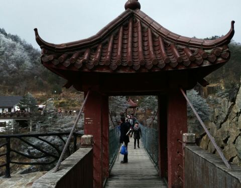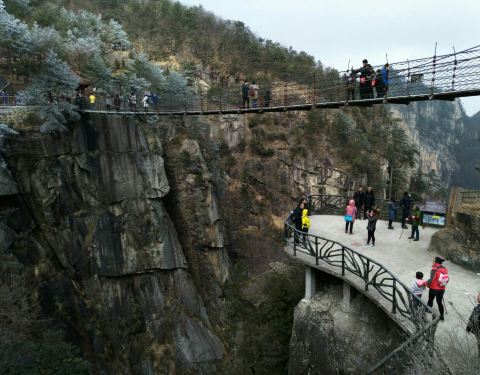 索桥在二座山之间,下面是深渊,恐高的人最好不要上去,在桥上看风景特别好,前有瀑布,后有险峰。