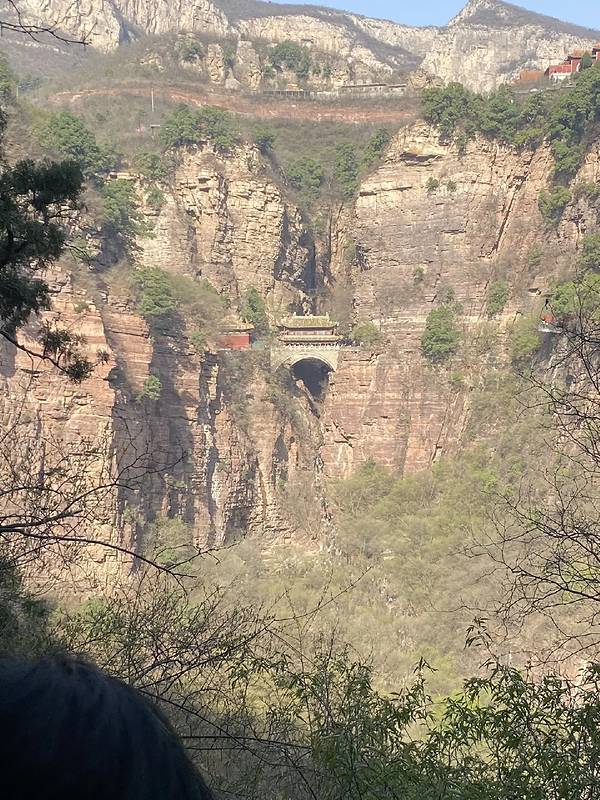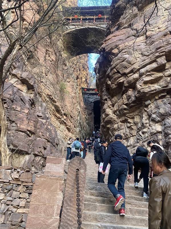 进苍岩山景区大门不远,会有一段长长向上的台阶路,最末一段还比较陡,在这段道上就可以看见桥楼殿悬在头顶上。