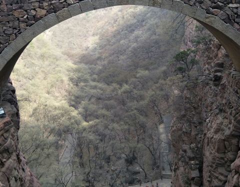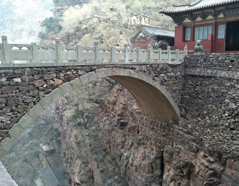 苍岩山天王殿东17米处为桥楼殿,由于所处两崖间距大于小石桥,且高度 89米,故跨度大,且仿赵州大石桥