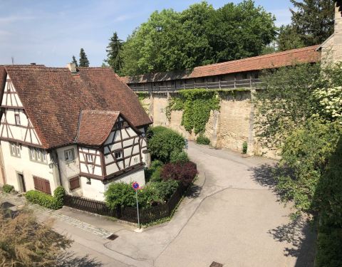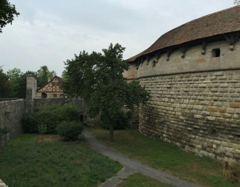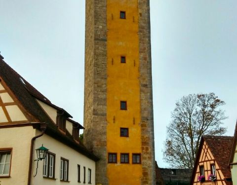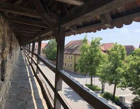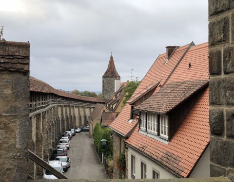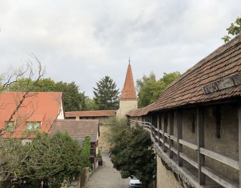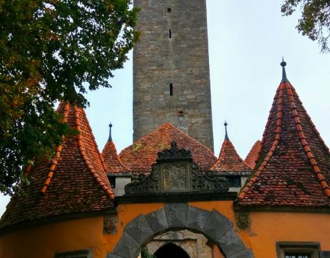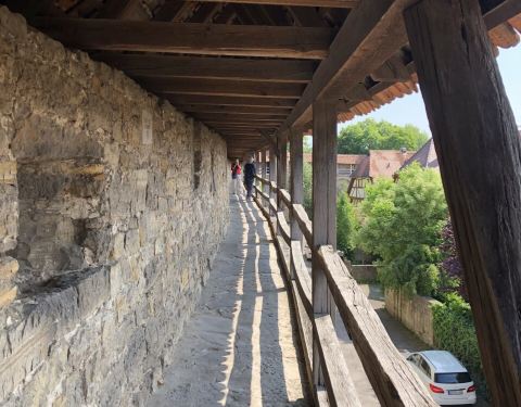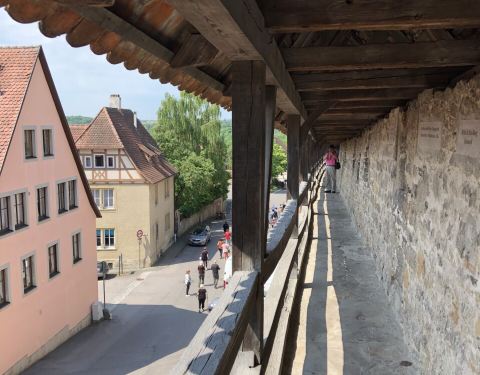 罗滕堡于1172年建市,开始修建城墙,直到现在这个市墙保存完好,它的城墙与国内城墙有点不一样,它有屋顶,但也有瞭望孔,站在城墙上可以看到城内城外的景色。