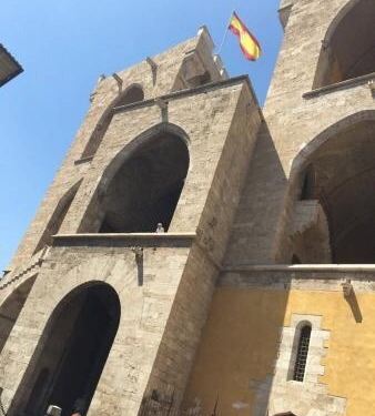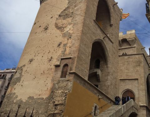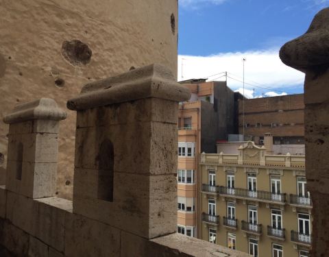 这是我们那天瓦伦西亚行的第一站~我很喜欢这个塔~~ 一步一步登上塔楼~~可以从各个方向各个角度观看瓦伦西亚老城的美景~~ 古城墙是老城的边界 之外就是已经干涸的护城河 我觉得特别棒的一点在于 现在被改造成了各种运动场和休闲娱乐的空间~~~ 这个城市年轻运动的活力 与 老城的优雅静谧在此处碰撞~实在太棒了!!!