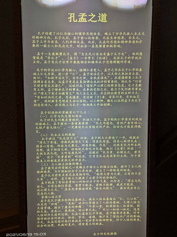 主要是孟子馆,讲孟子由来和典故,有视频介绍,人也不多,非常舒坦的博物馆主要是孟子馆,讲孟子由来和典故,有视频介绍,人也不多,非常舒坦的博物馆。博物馆拿身份证就可以免费进去,门口也很大的免费停车场,真的不错