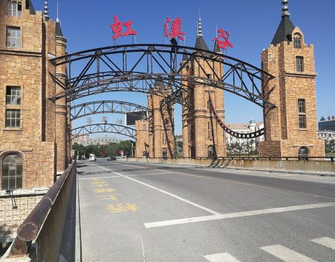 营口市的思拉堡小镇,以虹溪谷欧式大桥做为了地标建筑,把南北两側的家庭式温泉和酒式温泉给分割开,南北两侧的各式各样的温泉形成了不同风格的温泉。