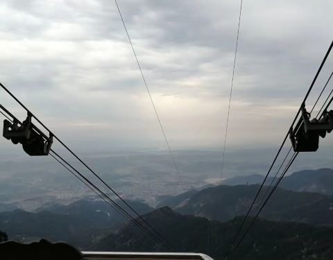 因为爬衡山,带着六岁的孩子爬了七个小时,终于爬上去了,所以下山坐的索道,这可能是我坐过的最差的索道了