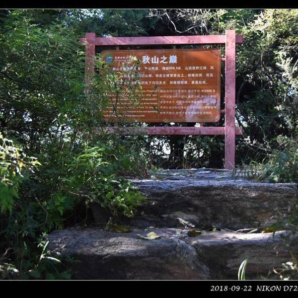 我就这么走着拍着倒也没觉得有多累,不知不觉间,拐过一道道山弯后就看见前面台阶的尽头高处有了路牌儿“秋山之巅”