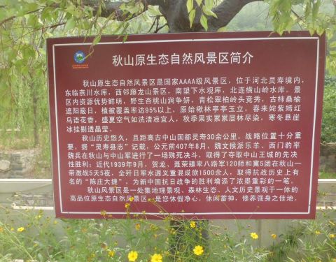 早上九点从石家庄出发,十点半左右到秋山。主要平山县城到秋山景区的路况不好,开的有点慢,返回时的路况较好。同程网上定的票,景区付现取票很方便,服务也很好,很满意。早上吃过饭才去的,在景区玩完就直接回了。山上果树较多,但去时基本没果子,就碰到棵梨树,摘了两个,挺好吃。山上有家餐馆和一些买水果饮料的,我们去时天气比较热,自己带一瓶水完全不够喝,建议多带水。上山路都是石阶,但下山路有部分是土路,遇到阴天或下雨就比较难走。我们是晴天去的,天气比较热,湖水和小溪都干涸了,走的都比较累,海拔900米,不算太高,建议不热不凉无雨时去。山上阴凉地挺多的,也有座椅,休息很方便。洗手间外形很有特色,里边也比较干净。