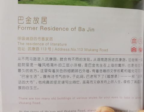 ...前人很少,自从武康路变成“网红”后,人就多起来了~以前可以安安静静的参观,现在有时还要排队进入不用买门票就可以直接进入参观,以前人很少,自从武康路变成“网红”后,人就多起来了~以前可以安安静静的参观,现在有时还要排队进入。。。 巴金故居是一个私家别墅,可参观的区域只有上下两层,一楼内藏有巴金...不用买门票就可以直接进入参观,以前人很少,自从武康路变成“网红”后,人就多起来了~以前可以安安静静的参观,现在有时还要排队进入。。。 巴金故居是一个私家别墅,可参观的区域只有上下两层,一楼内藏有巴金在世时写的手稿,可以清晰的看到一些批注在上面,很是真实。二楼是卧室,很精致的一个别墅,在那样的年代,这样的条件,应该是很幸福的。 展开