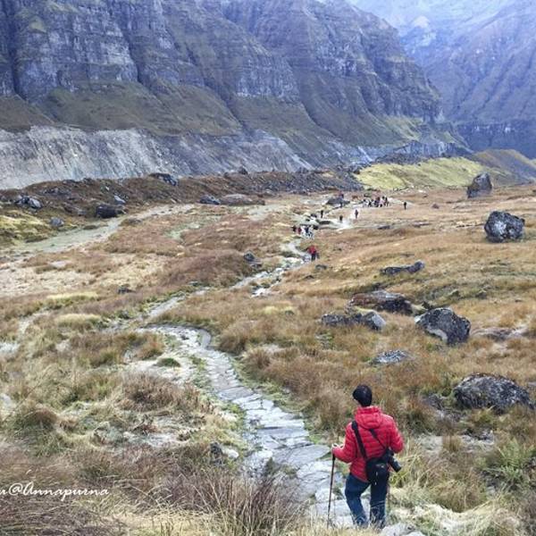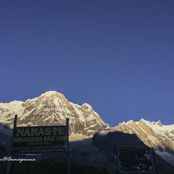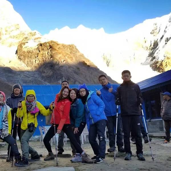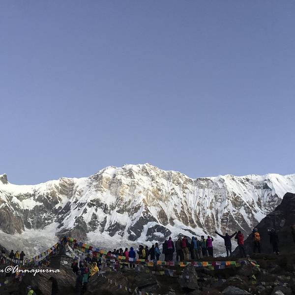 穿过住宿区,雪山脚下的观景台前已经人头蹿头,看安娜普尔娜在面前一字排开,壮观难以言喻!日照金山要等到6点哦,所以其实没有必要太早上来。很冷MBC小分队和ABC小分队顺利会师啦!!天色渐渐亮堂起来,再看一眼安娜普尔娜,恋恋不舍开始下撤。之前在夜色中从MBC走到ABC,错过了一路的好风景,回程 下撤终于有机会一览雪山环绕的山谷景色, 虽然雪线有点高,但是依然壮美!