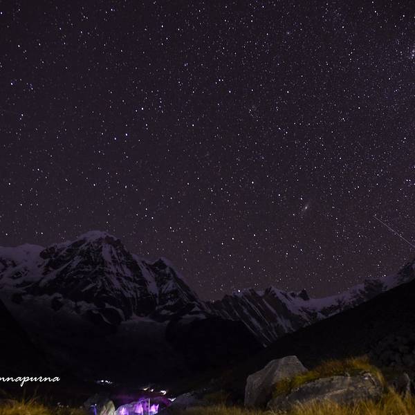 没有睡醒+负重相机+海拔渐高,没走几步我就喘的不行,通往ABC的道路人挨着人,一停下来休息就被好多人赶超。。。走不动只能量力而行, 索性停下来拍拍雪山星空休息一下在一片昏暗中,隐约看到安娜普尔娜。 从MBC到ABC也是走在河谷之间,四周雪山环绕。山路比较平缓,但是还是走的好喘大约走了2个小时,终于到ABC拉!!ABC的客栈数量比MBC多很多,但是忙季基本都能住满,所以最好还是提前预订。