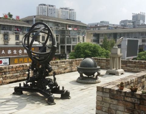 ...走到鼓楼的二层,是个展览厅,室外摆放着许多古时精密的天文观测仪器,有地动仪、日晷、黄道经纬仪等