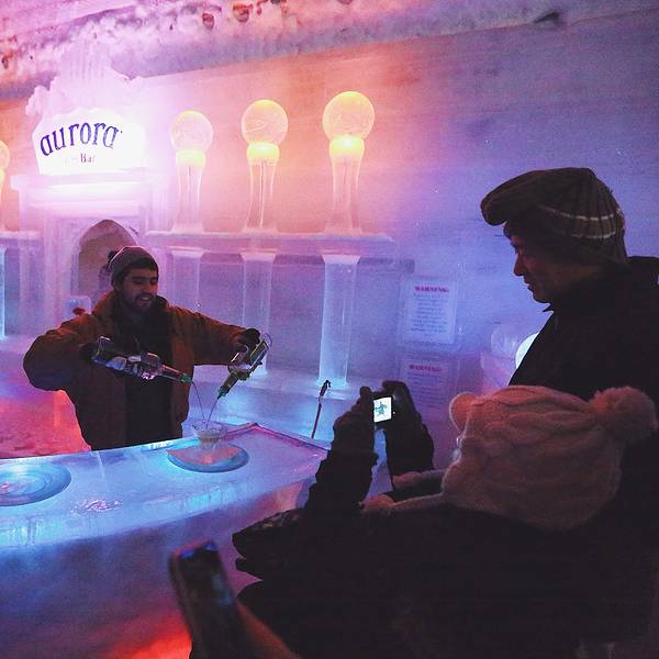 零下20度中泡在45度左右的水中,那种感觉别提有多震撼。打湿的头发没过一会就结冰了,眼睛的睫毛上也同样结冰。泡完温泉后去旁边的冰雕博物馆,里面的杯子是可以食用的因为是冰块做成的。这个景点必去!
