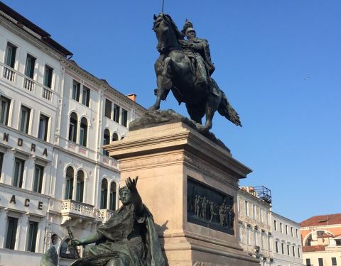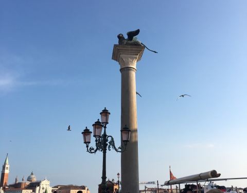 实际上位于圣马可广场的迎宾口,有两根高大的圆柱矗立着两座雕塑,一座是飞狮,一座是威尼斯的保护神。这里的视野比较好,看大运河,看海景都挺合适。
