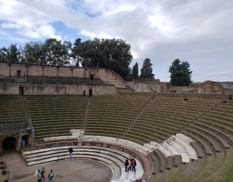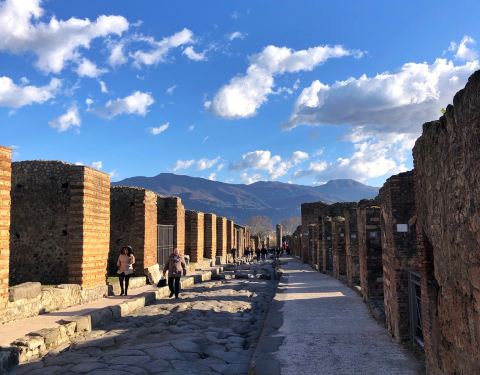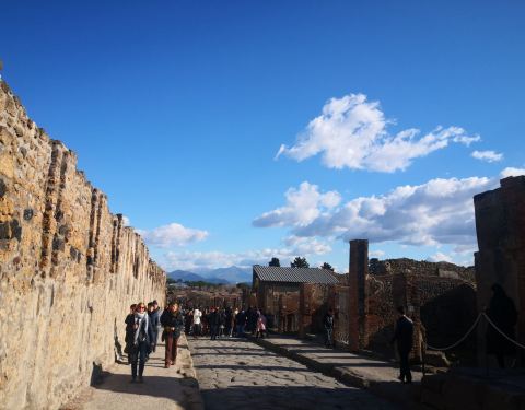 参观被火山掩埋的古城罗马圆形剧场、私人豪宅、广场浮雕等遗迹。