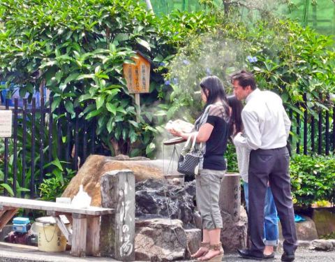 我们一出热海车站,眼前就是免费的泡脚温泉。当地居民和游客围着池子坐在一起,裤腿挽到膝盖之上,聊着天,看着报在冒着热气的池子泡脚呢。旁边有销售小毛巾的机器,每条100日元。免费池子每天上午9点到下午4点开放。热海市面积61.56平方公里,而且到处有温泉。特别奇特的是,街边有一处温泉冒着热气,牌子上写着是98度,供路人煮鸡蛋,有专门的铁丝筐可放鸡蛋。有位妇女从马路对面过来,一下子把十几个鸡蛋放进筐里,盖上盖子后,坐在凳子上玩手机。她说五六分钟就煮好了。热海是个港口城市,很多商店卖海产品干货和制成品。漂亮的小鱼干一般长,穿成一串或在精致的包装盒里排成一列,也就是折合人民币三四十元。还有制成的鱼酱,鱼片之类的,买的人很多。