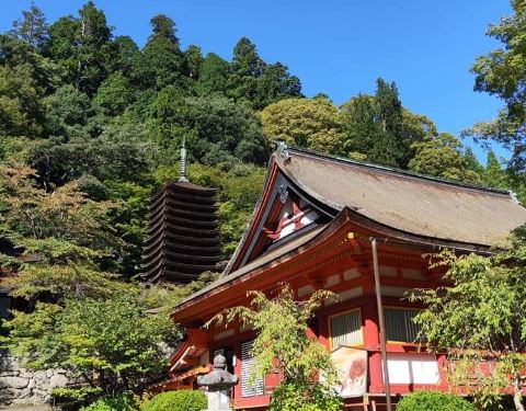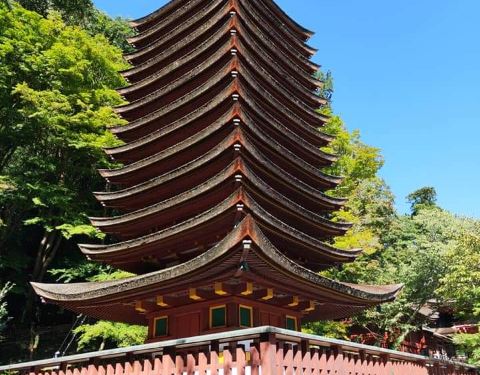 位于 奈良 县樱井市的一座山上神社,交通很方便快捷,乘坐JR 奈良 站到JR樱井站30分钟,再乘坐巴士大约25分钟,最后步行3分钟就到神社了。 神社内的十三重塔,这是世界上唯一一座木质结构的十三层塔,非常壮观。 到了春天和秋天,漫山的樱花或是火一样的红枫,衬托得朱红色的神社更加美丽。