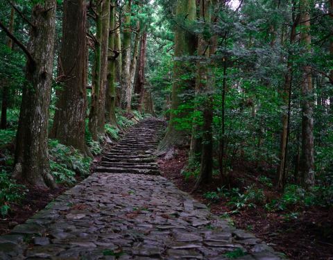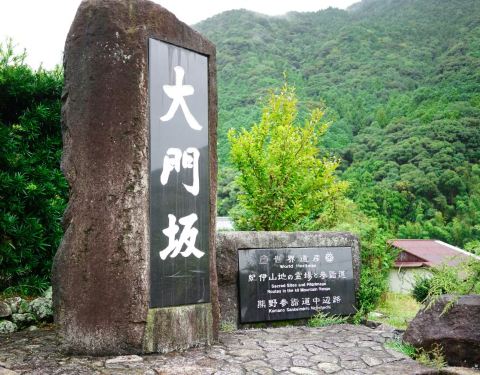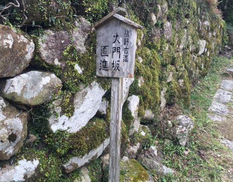 熊野古道是古时由京都往熊野三山(熊野本宫大社、速玉大社、那智大社)的参拜道,沿途仍留有昔日风情,参拜者至今络绎不绝。通往熊野本宫大社的大门坂位于郁郁葱葱的杉树丛中,大门坂是熊野古道中人气较高的地方,参天巨木夹道显得庄严,长满青苔的石阶为当年铺设之物,人们可以轻松品味漫步青苔石阶道这一原汁原味的景象。