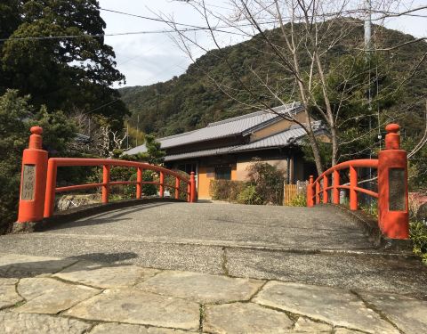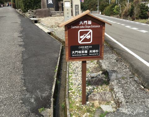 从这里上山是为了不远处山间的平安服饰体验。自公路边向上走,三分钟便到了大门坂茶屋,也就是穿越到平安时代的起始之地。 茶屋的主人是一位五六十岁的奶奶,事实上还有一位将近九十岁的奶奶,茶屋中的各种织物都是由老奶奶亲手编织的,可惜我们去的那天老奶奶似乎不在家。主人听说我们要租用服饰上山有些吃惊,因为一般人都是选择一小时套餐在茶屋附近的夫妇杉逛逛拍照就好,上山实在辛苦(虽然我只听懂了一句tired→发音是太耶都)。不过等到换好衣服之后,感觉这样登山上顶实在是一种庄严的修行仪式,所以上山的信念更强了呢╮(╯▽╰)╭ 主人送我们到夫妇杉,往后的路就要我们自己走了(?)。从大门坂茶屋到本参道,大约1.2公里,半个小时就可走到。
